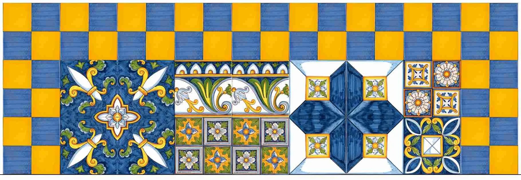 Patchwork di piastrelle decorate a mano in formato cm 20×20 (eventualmente componibile con abbinamento di piastrelle da cm 20×20 e 10×10), per il rivestimento di bagni, box doccia, cucine, para schizzi, pavimenti, terrazze, locali, banconi bar, tavoli piastrellati.