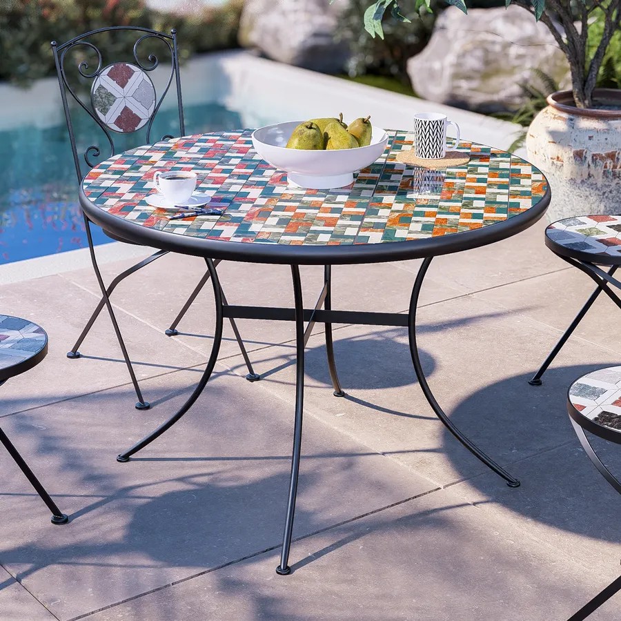 Tavolo da giardino rotondo 110 cm in metallo nero con mosaico patchwork in ceramica